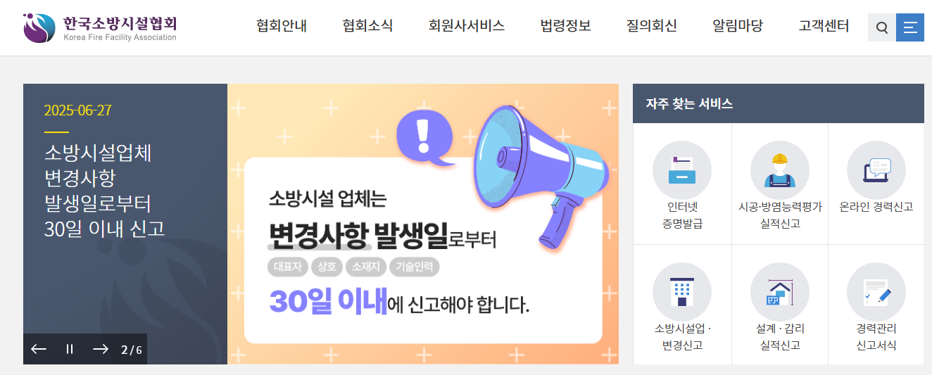 협회 홈페이지에서는 인터넷 증명발급, 시공 및 방염능력평가 실적신고, 온라인 경력신고, 소방시설업 변경신고, 설계 및 감리 실적신고 등의 서비스를 이용할 수 있습니다. 발급된 수첩의 진위확인 서비스를 제공하여 위조 방지에 기여하며, 시공능력평가 공시와 방염능력평가 공시 정보를 확인할 수 있습니다. 소방공무원 전용 기술자 및 감리원 배치 종합정보시스템을 운영하여 소방관서에서 필요한 정보를 조회할 수 있도록 지원합니다.