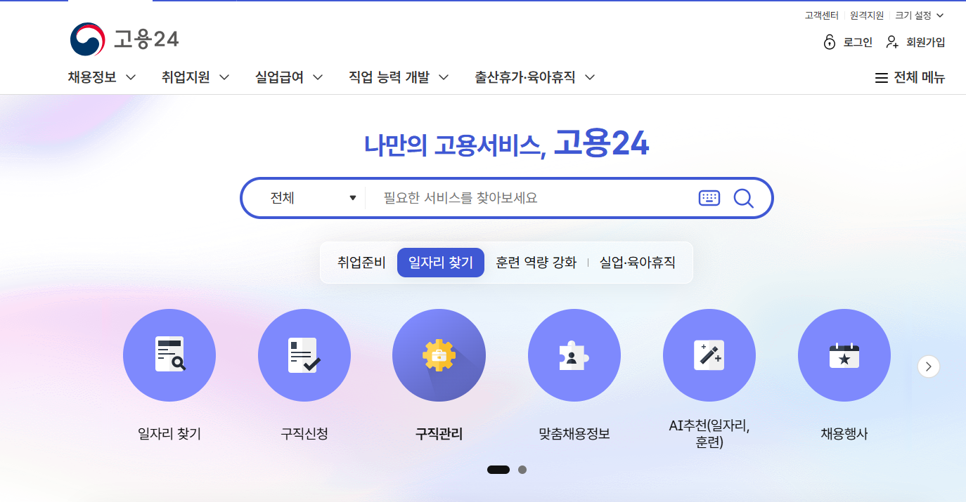 2024년부터 운영되기 시작한 고용24는 그동안 분산되어 있던 워크넷, 고용보험, HRD-net, 국민취업지원제도 등 9개의 홈페이지를 통합한 원스톱 고용서비스 플랫폼입니다. 개인회원은 일자리 검색, 구직신청, 실업급여 신청, 출산휴가급여 신청, 국민내일배움카드 신청 등을 한 곳에서 처리할 수 있습니다.